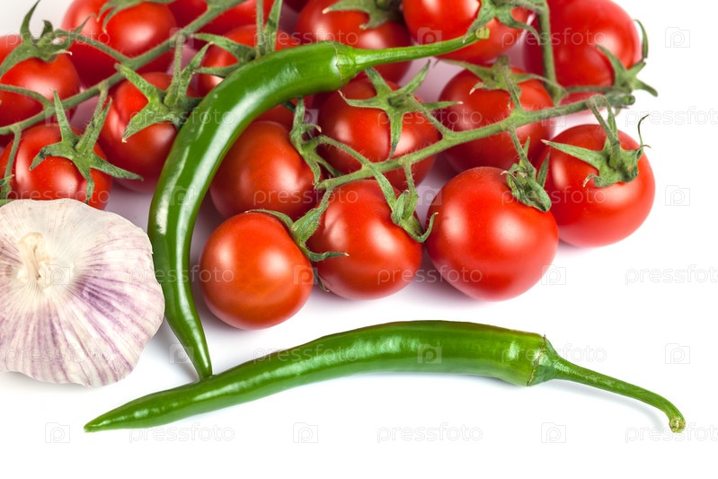 Помидоры, зеленый перец и другие овощи на белом фоне