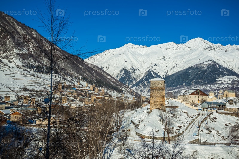 Средневековые башни в Местии в горах Кавказа, Верхняя Сванетия, Грузия