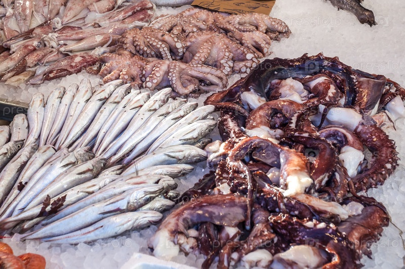 Различная свежая рыба и морепродукты на льду