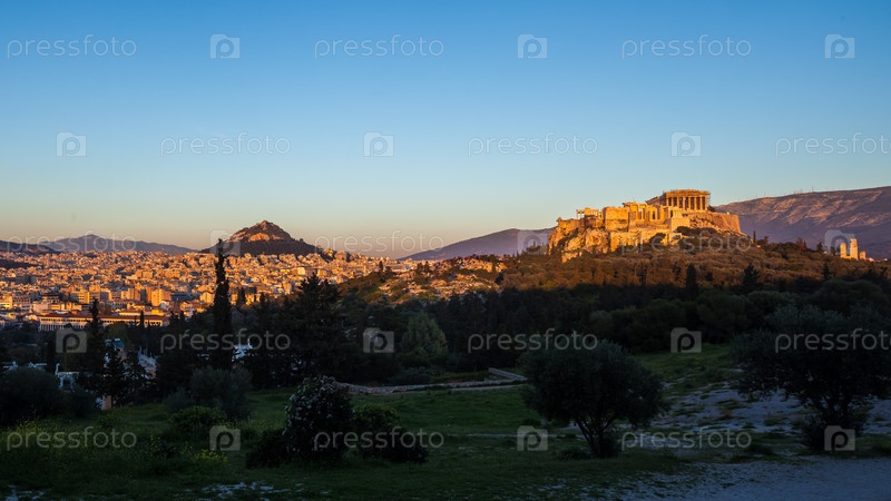 Парфенон храм на Акрополе в Афинах во время красочного заката, Греция