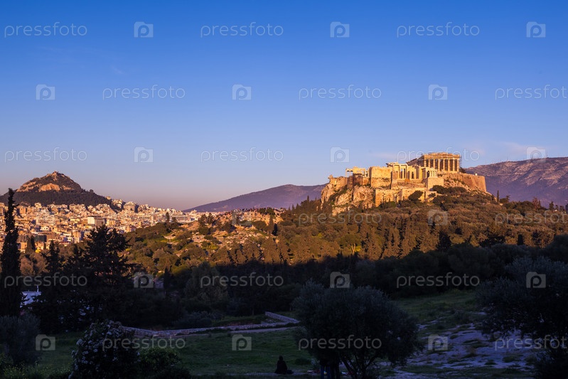 Парфенон храм на Акрополе в Афинах во время красочного заката, Греция