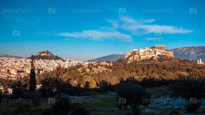 Парфенон храм на Акрополе в Афинах во время красочного заката, Греция