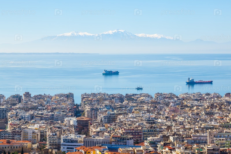 Вид на город Салоники, море и корабли