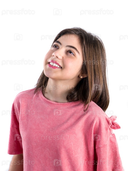 Счастливая красивая маленькая девочка позирует перед камерой на белом фоне