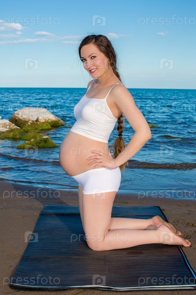 Беременная женщина в спортивном бюстгальтере делать упражнения на релаксацию на берегу моря