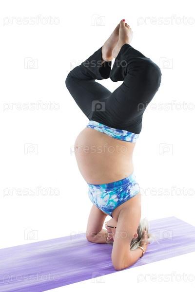 Беременная женщина занимается йогой или пилатесом на белом фоне. Концепция спорта и здоровья