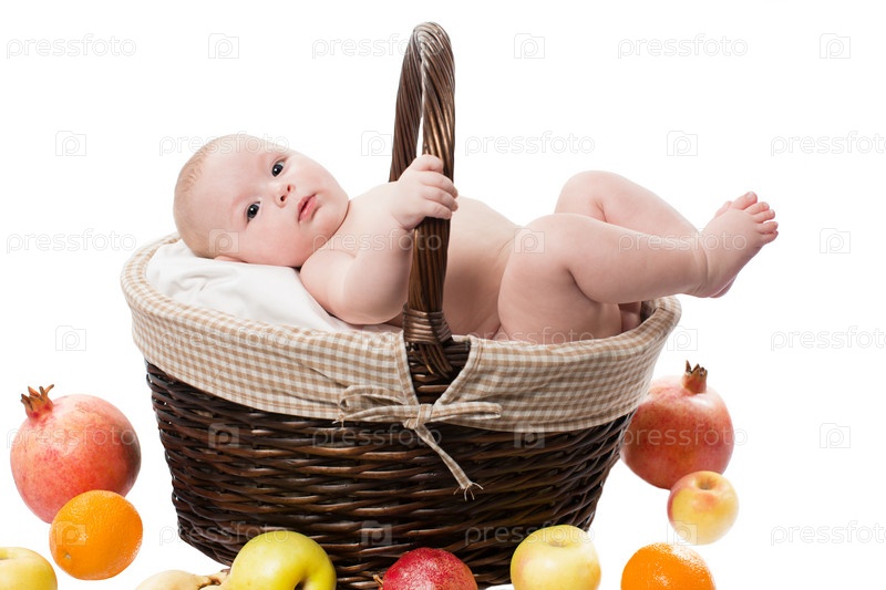 Девочка в корзине с фруктами, изолированная на белом фоне. Понятие детства