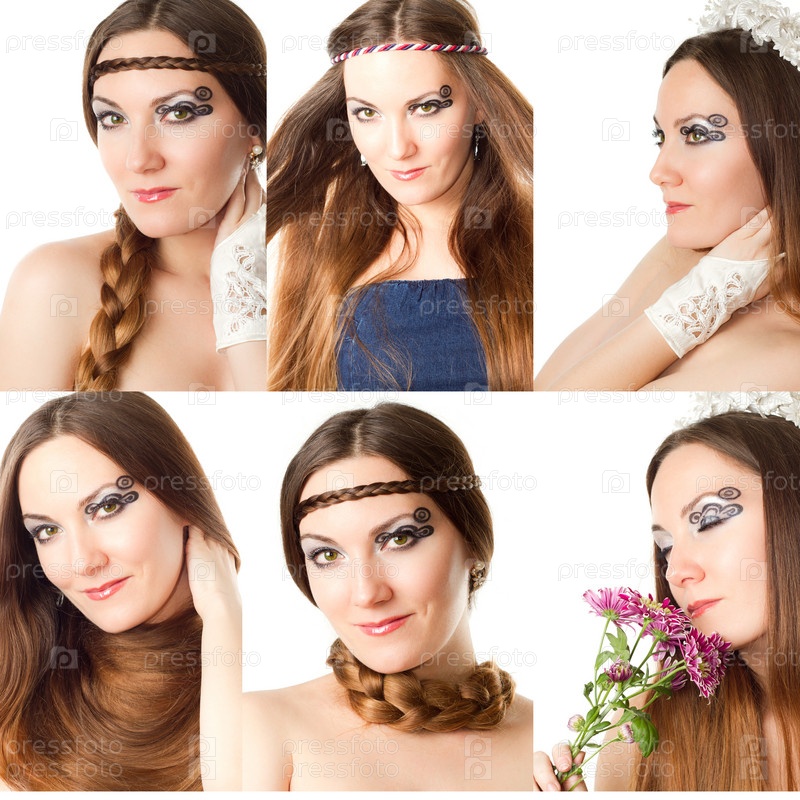 Коллаж. Красивые молодые женщины со стильным макияжем и прическами