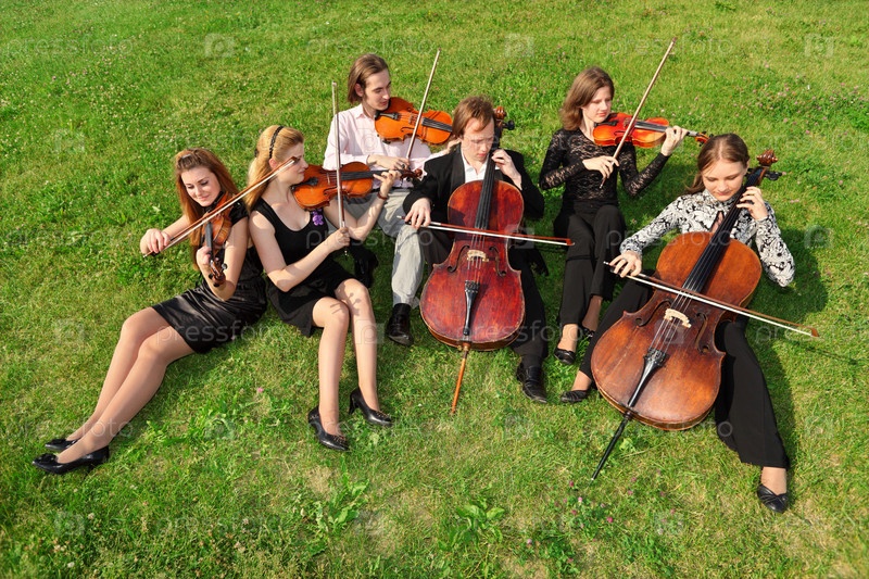 Шесть музыкантов сидят на траве и играют
