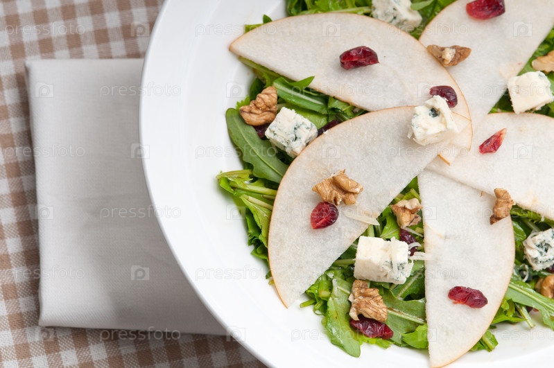 Свежий салат с грушей, рукколой, сыром горгонзола