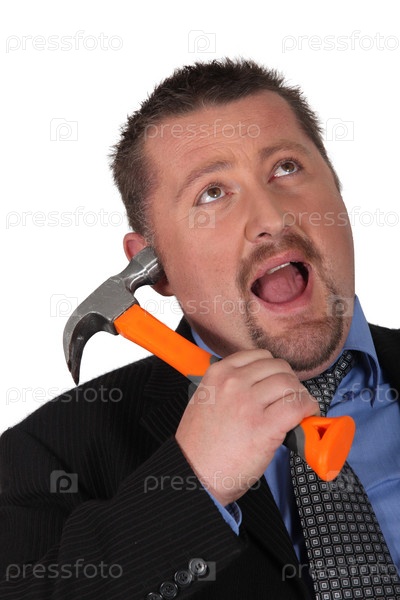 Мужчина закрывает ухо молотком