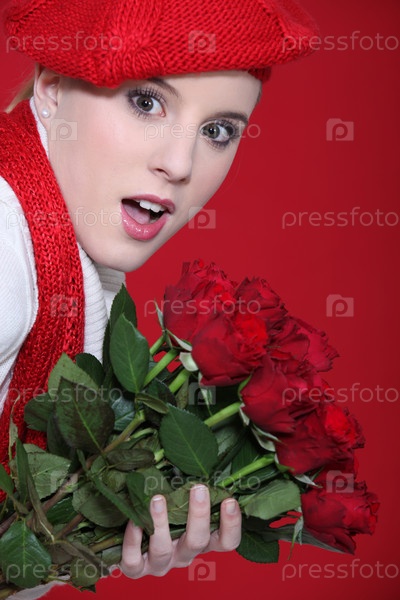 Портрет удивленной женщины с розами