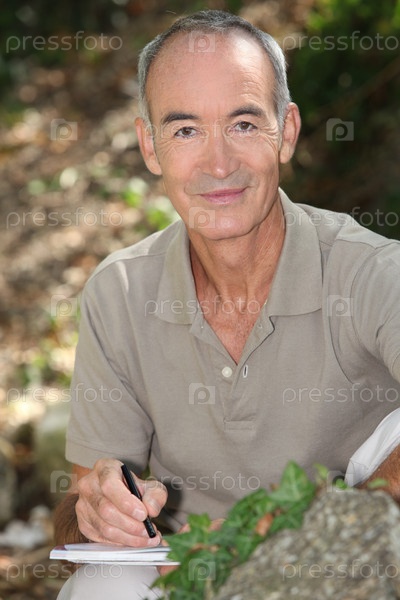 Пожилой мужчина пишет в сельской местности