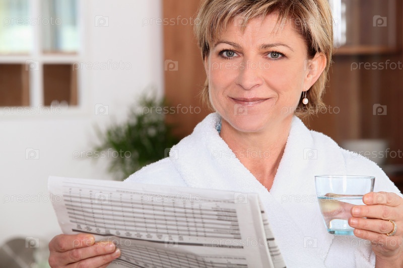 Женщина пьет воду и читает