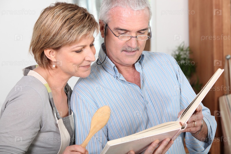 Пожилая пара читает книгу рецептов