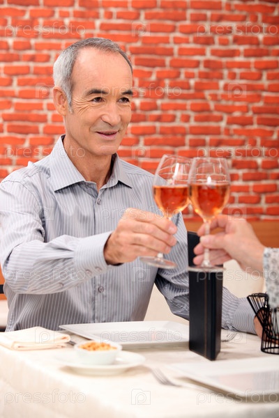 Пожилой мужчина поднимает бокал в ресторане