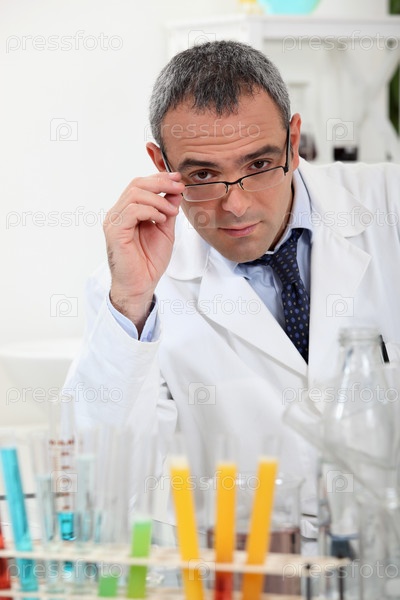 Ученый держится за очки за пробирками в лаборатории