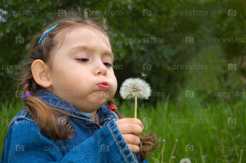 Маленькая девочка старательно дует на одуванчик на фоне зеленой травы