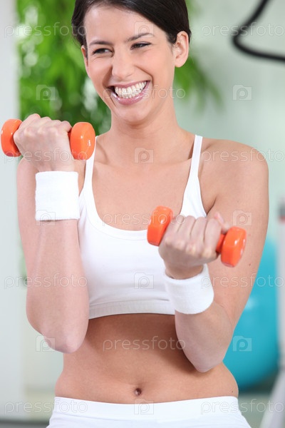 Женщина смеется, поднимая гантели
