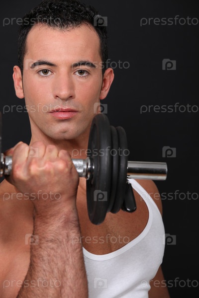Сильный мужчина поднимает штангу