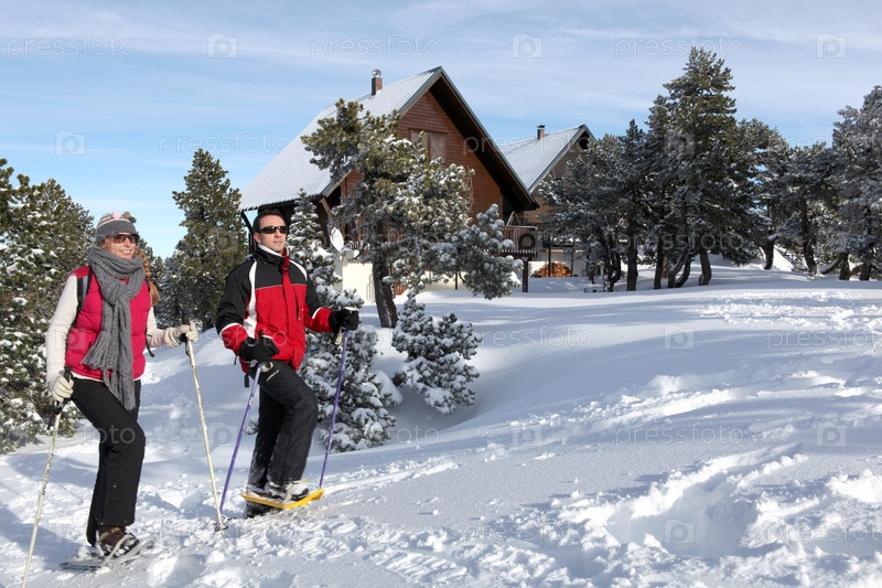 Пара гуляет в снегоступах