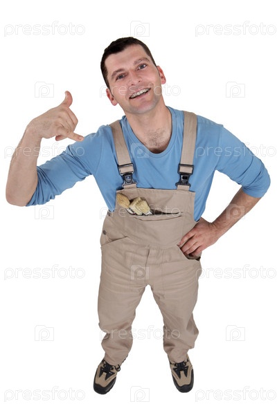 Рабочий показывает телефон жестом