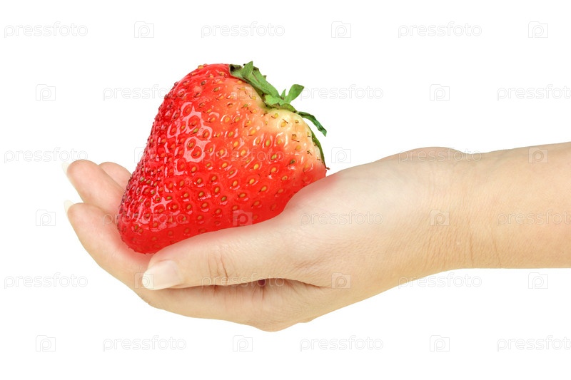 Огромная клубника в руке на белом фоне