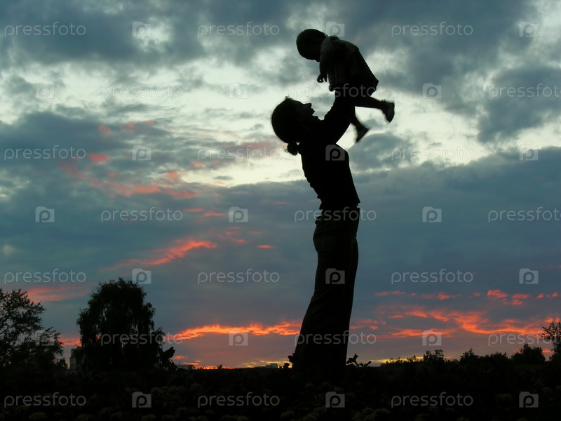 Силуэт матери с ребенком на фоне заката