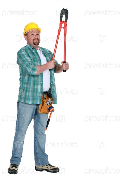 Рабочий держит пару больших кусачек
