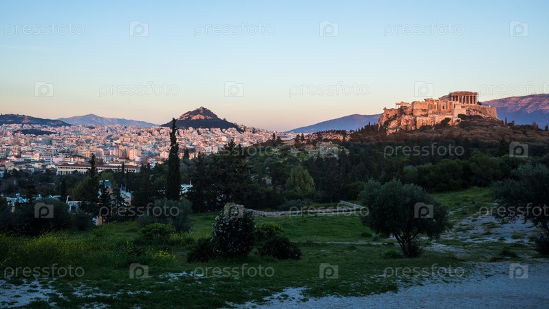 Парфенон храм на Акрополе в Афинах во время красочного заката, Греция