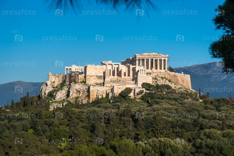 Парфенон храм на Акрополе в Афинах во время красочного заката, Греция