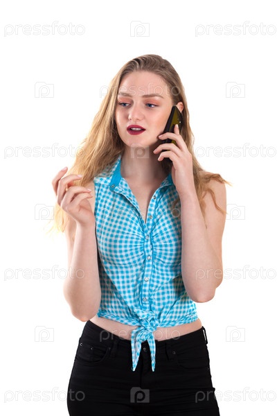 Молодая блондинка разговаривает по телефону на белом фоне