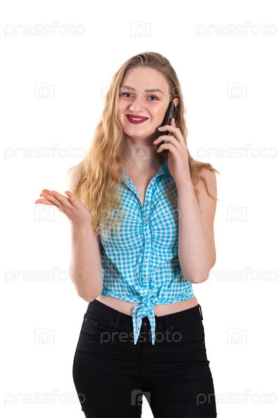 Молодая блондинка разговаривает по телефону на белом фоне