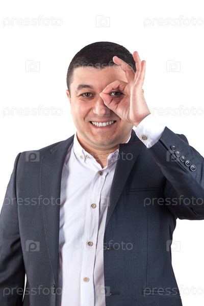 Молодой человек в черном костюме и показывает знак ОК