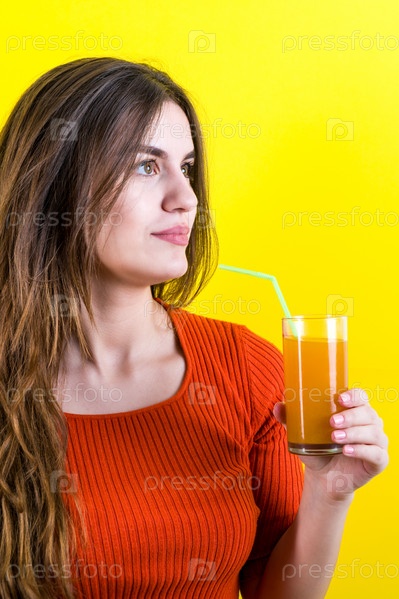 Девушка с апельсиновым соком на желтом фоне