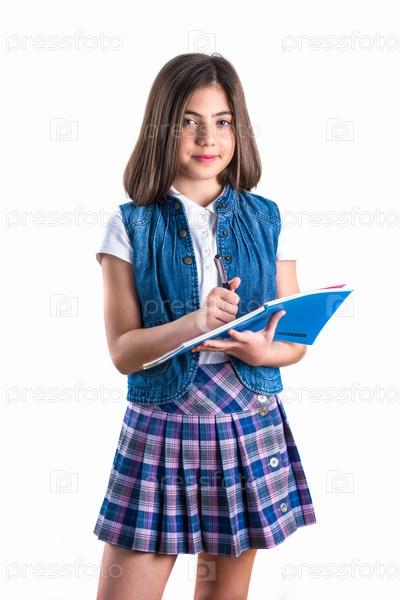 Красивая девушка в школьной форме с блокнотом в руке на белом фоне