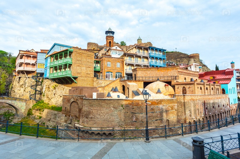 Старые ванны серы в районе Абанотубани с деревянными резными балконами в Старом городе Тбилиси, Грузия