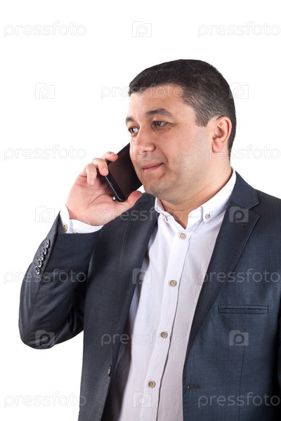 Мужчина в черном костюме с мобильном телефоном