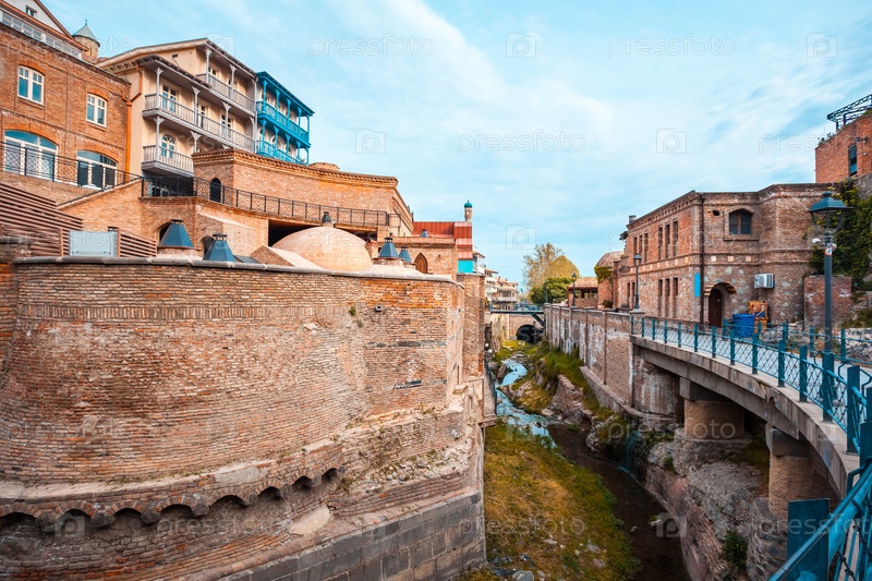 Старые ванны серы в районе Абанотубани с деревянными резными балконами в Старом городе Тбилиси, Грузия