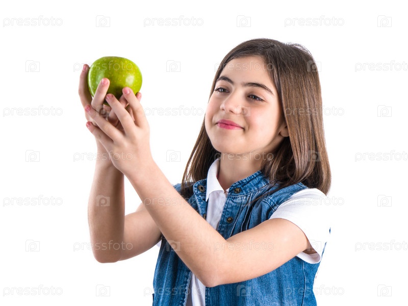 Симпатичная школьница с яблоком на белом фоне