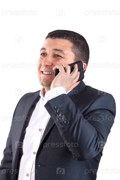 Мужчина в черном костюме с мобильном телефоном