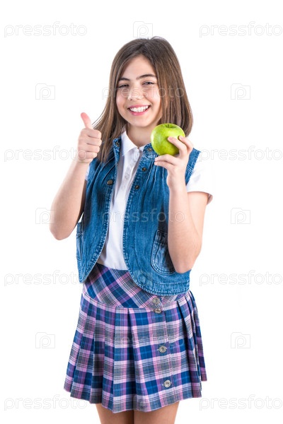 Симпатичная школьница с яблоком на белом фоне