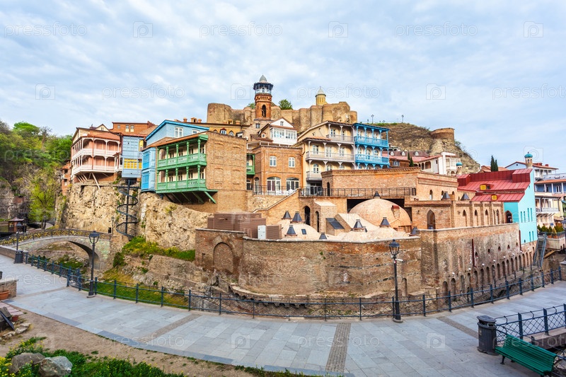 Старые ванны серы в районе Абанотубани с деревянными резными балконами в Старом городе Тбилиси, Грузия