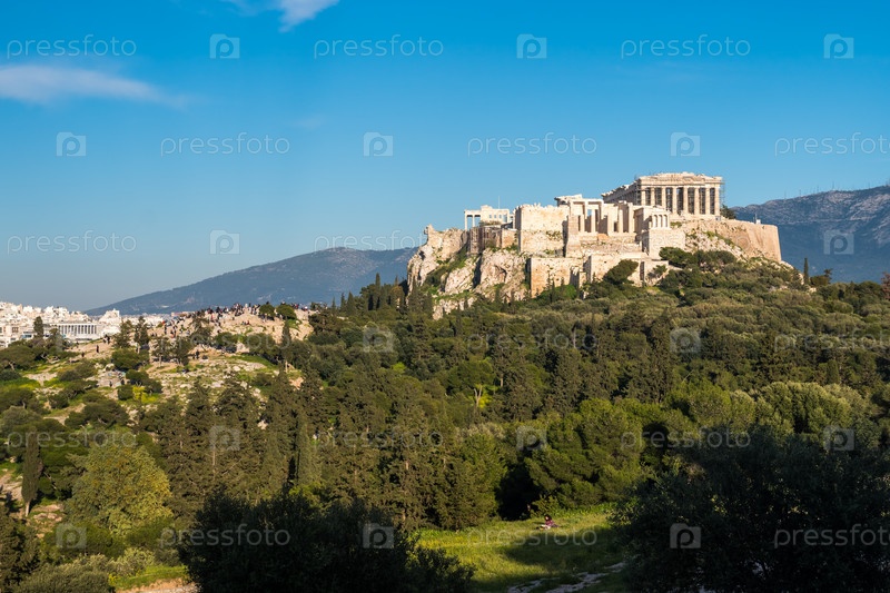 Парфенон храм на Акрополе в Афинах во время красочного заката, Греция