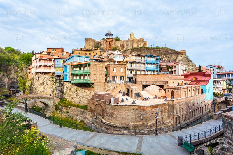 Старые ванны серы в районе Абанотубани с деревянными резными балконами в Старом городе Тбилиси, Грузия