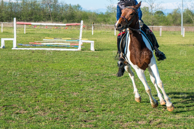 Маленький всадник тренирует лошадь на зеленой траве ипподрома