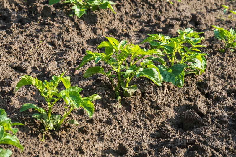 Молодые растения картофеля, растущие в огороде
