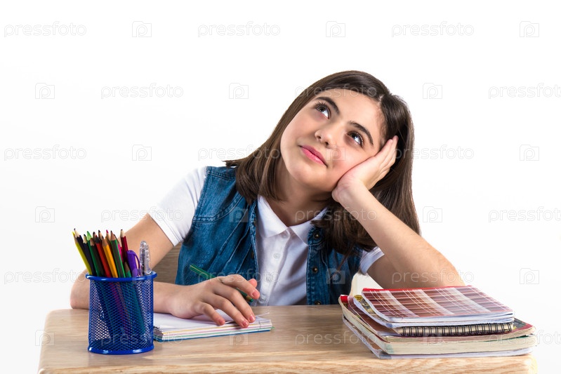 Красивая девушка сидит за столом и пишет письмо