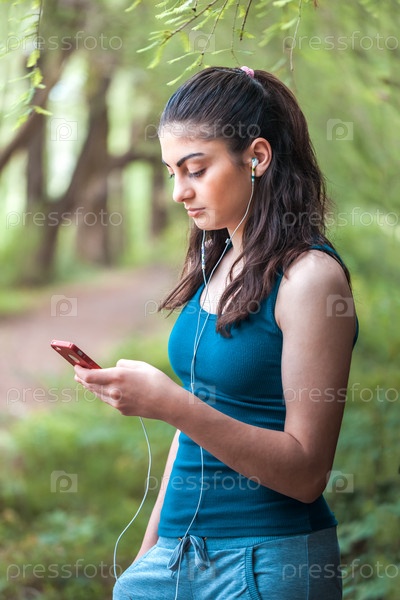 Девушка отдыхает в парке, используя смартфон