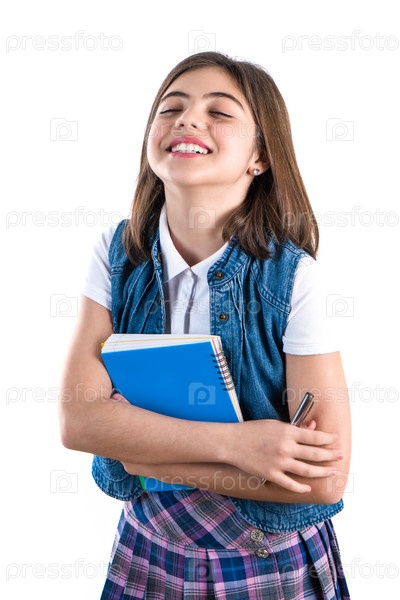 Красивая девушка в школьной форме с блокнотом в руке на белом фоне